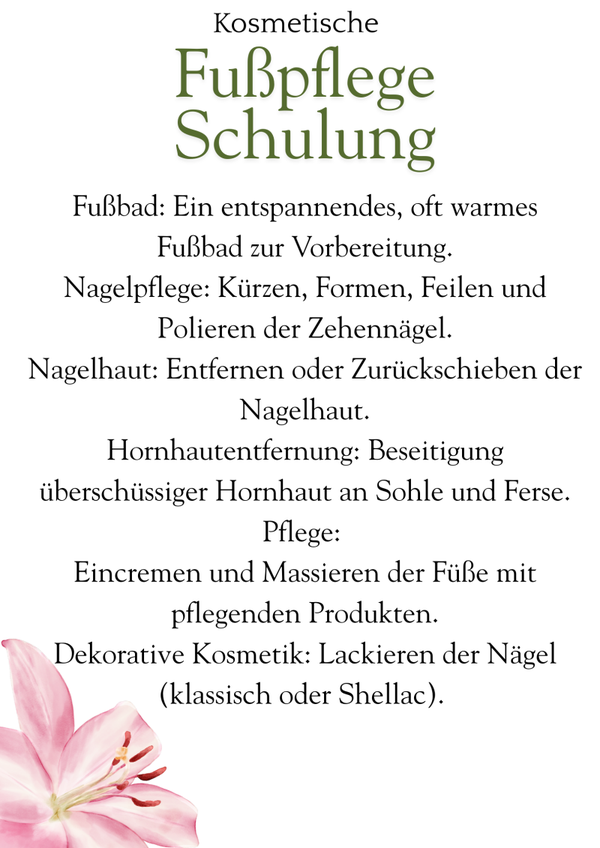 Diese Schulung umfasst alle Grundlagen der Kosmetischen Fußpflege Pediküre sowie Maniküre.